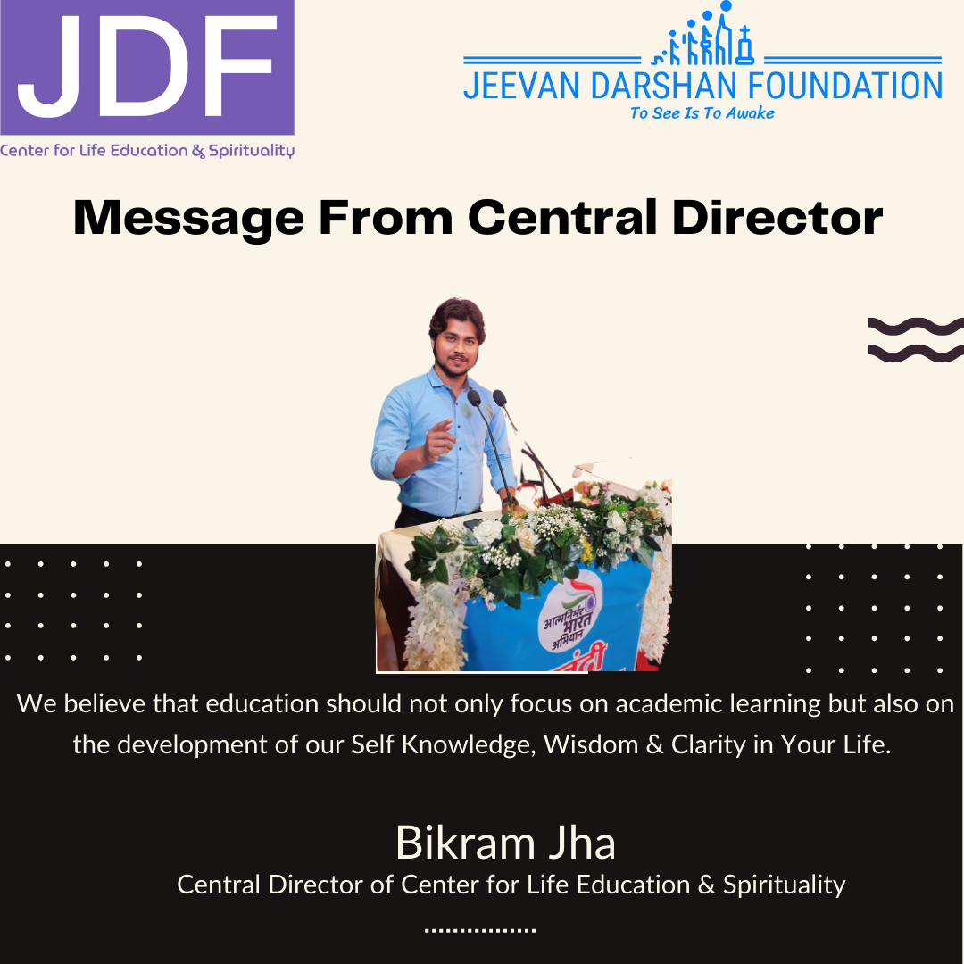 Jeevan Darshan Foundation (JDF) is a non-profit organization founded and led by Bikram Jha to address the growing crisis in human consciousness. JDF aims to nurturing a new way of living free from suffering, misery, and inner slavery and rooted in Self-observation, love, peace, Inner Freedom, Clarity & Oneness.